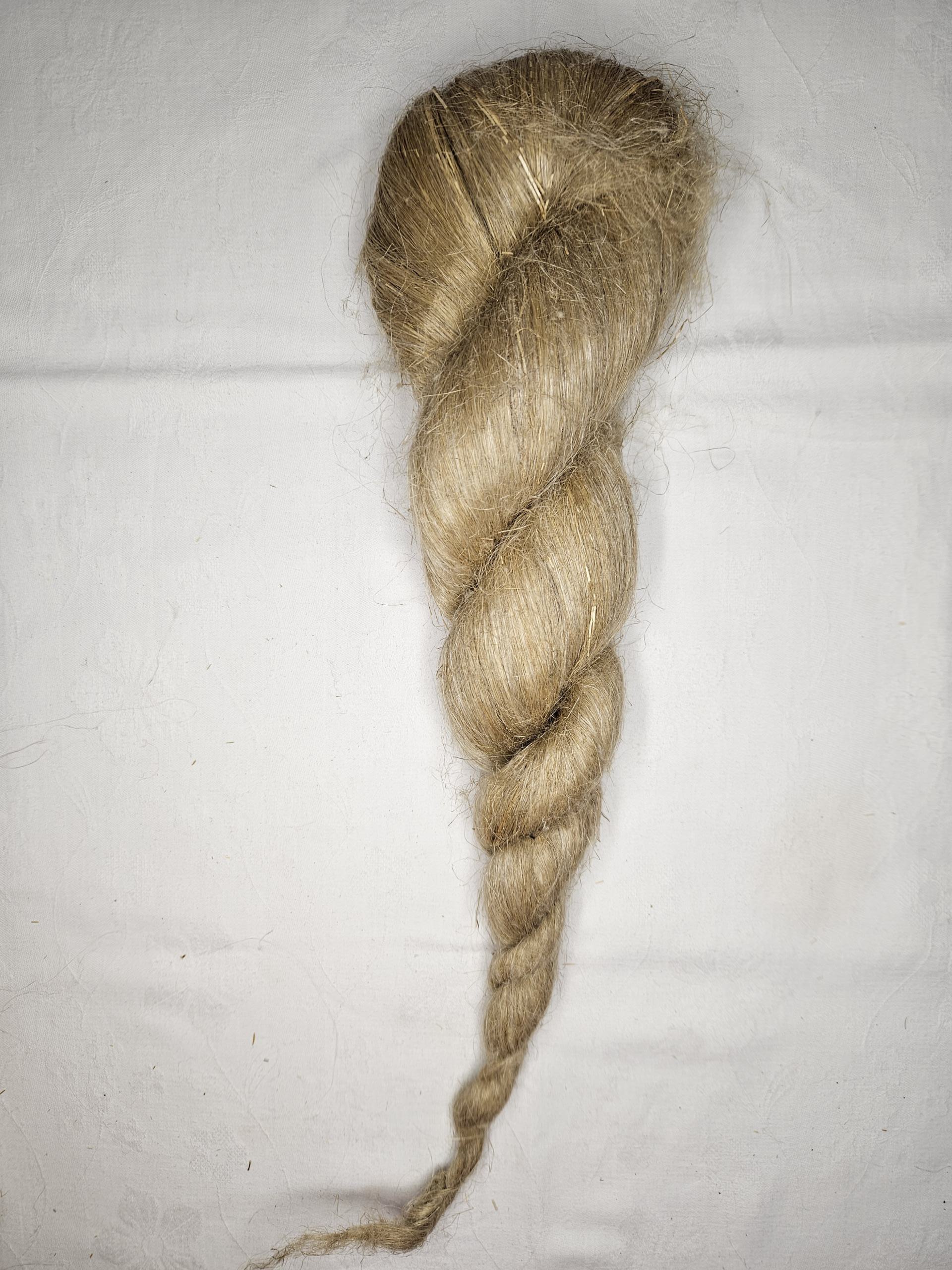 Die Flachszöpfe wurden vor mehreren Jahrzehnten von Hand bearbeitet, also nach der Raufe und der Röste gebrochen, geschwungen, gehechelt und schließlich zum Zopf gebunden. Durch die gute jahrelange Lagerung sind die Flachszöpfe heute noch so gut erhalten.
